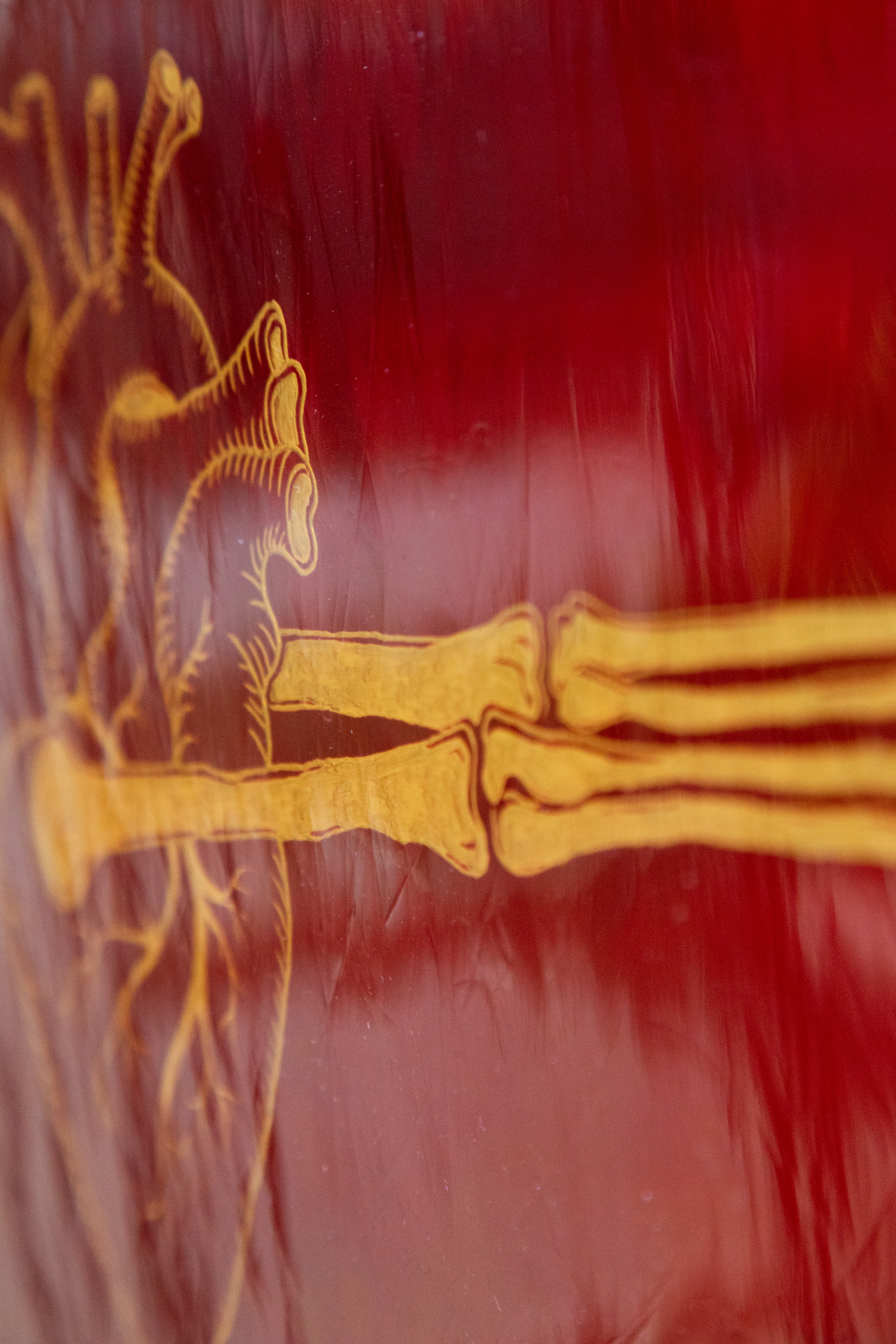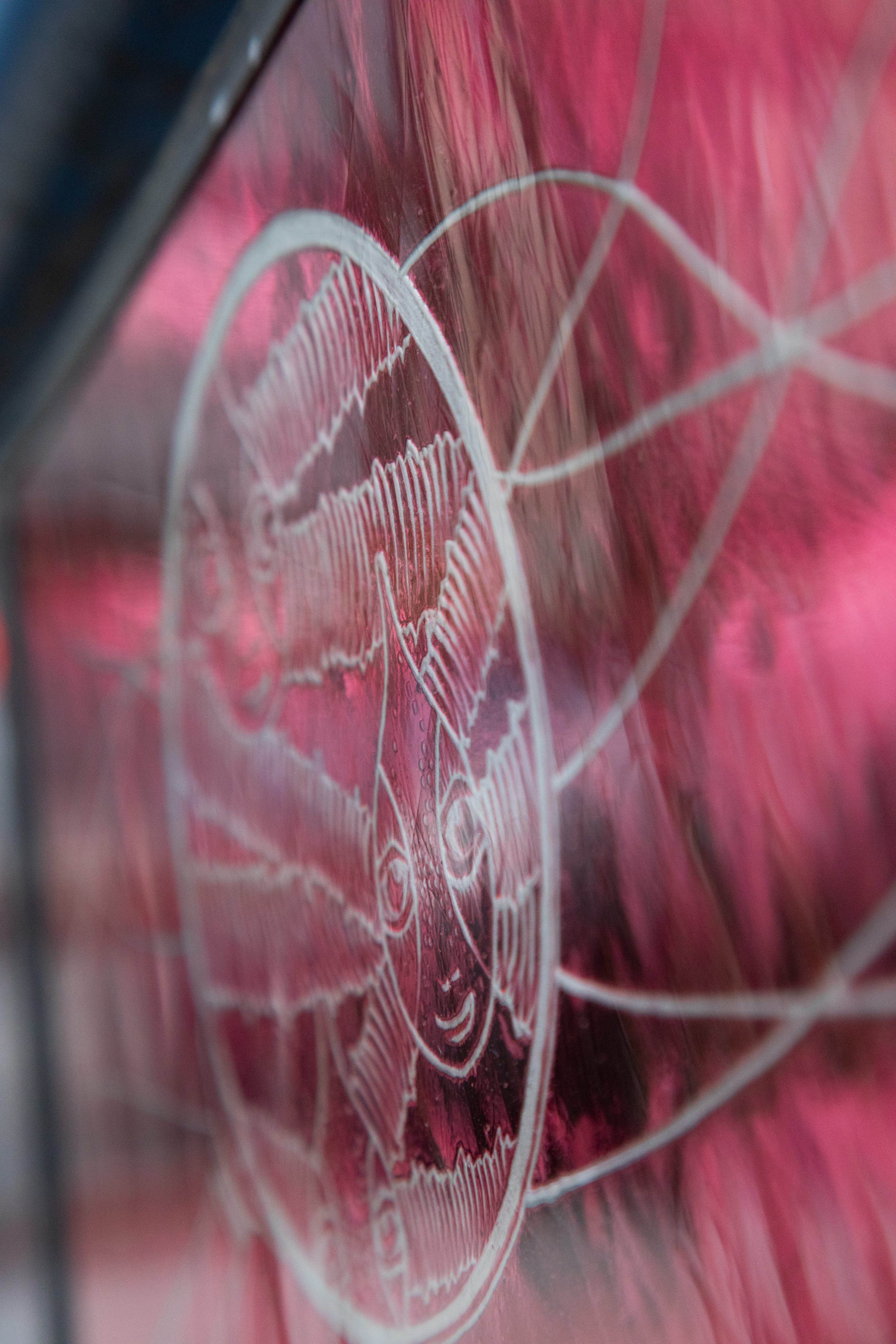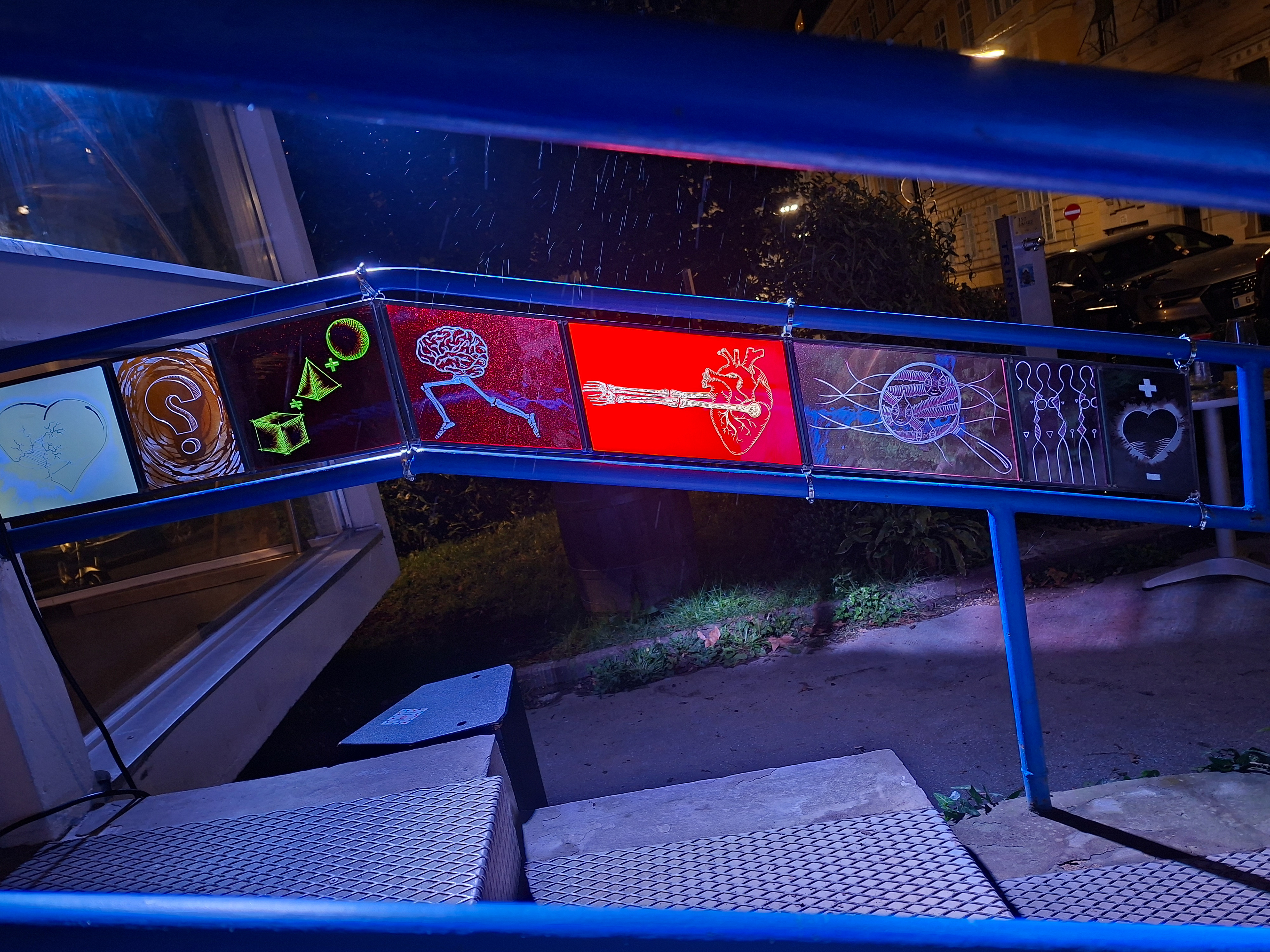 2025 - temporäre Geländerintervention mit mundgeblasenem Überfangglas, graviert, sandgestrahlt, gefasst / je ca. 20 x 30 cm