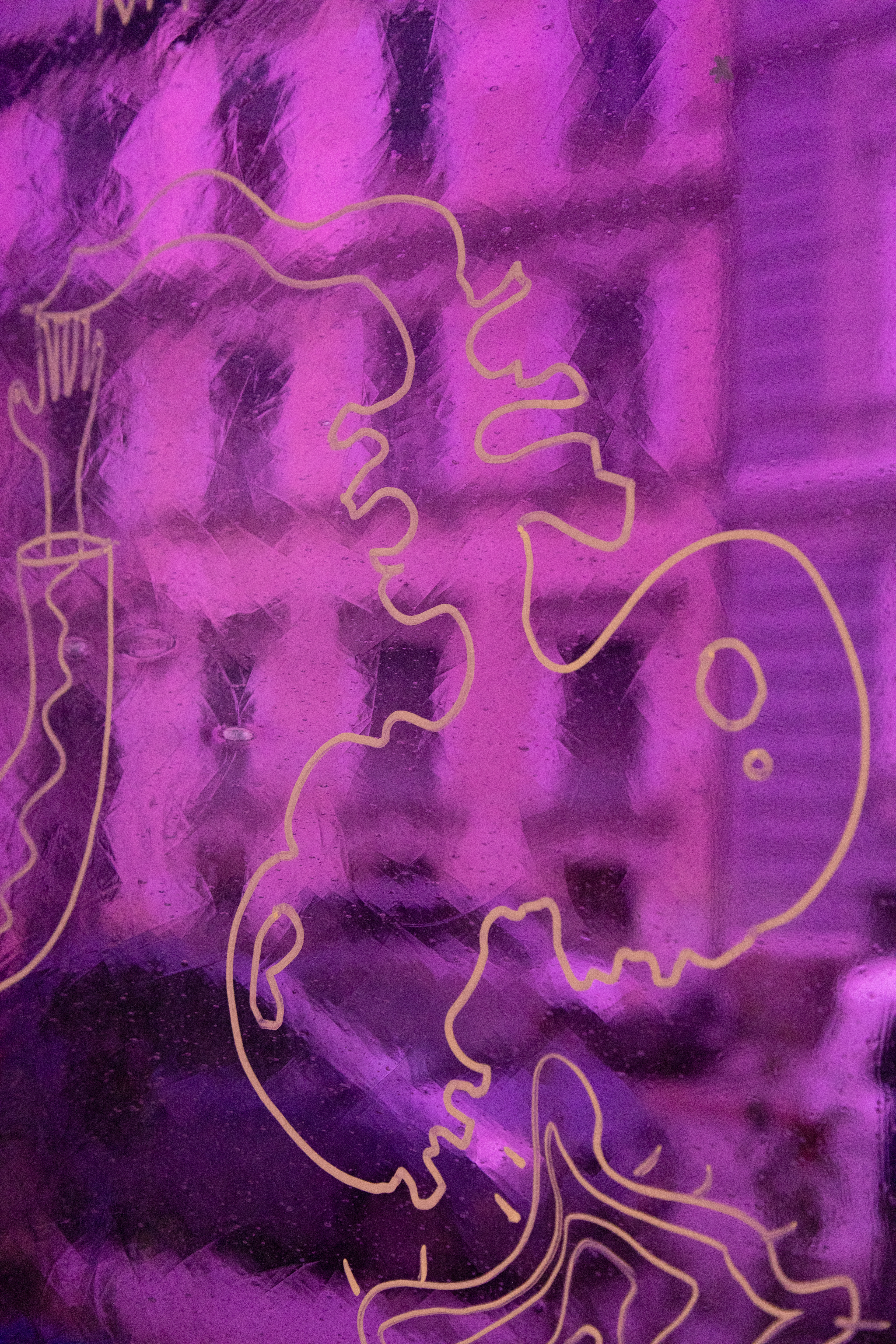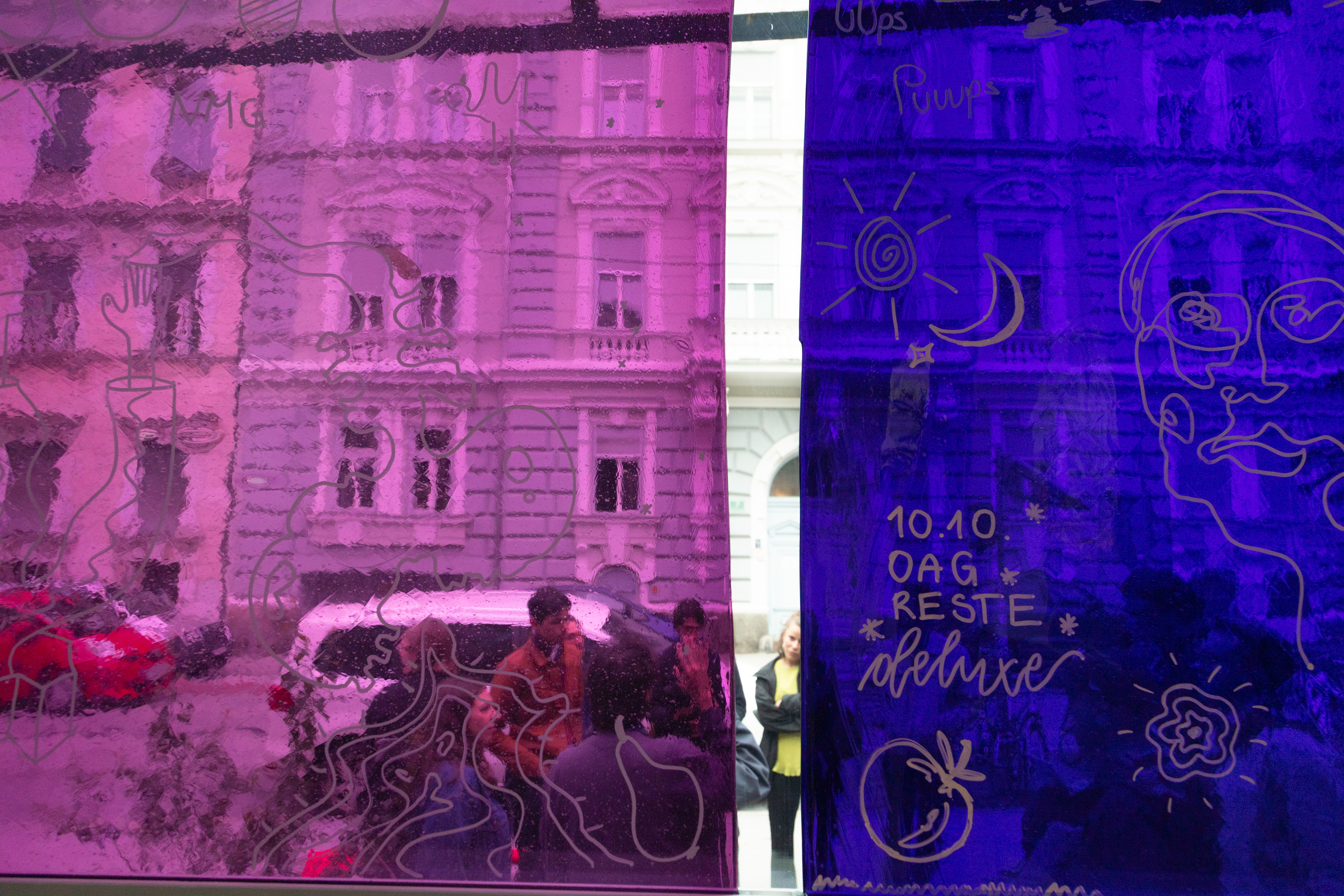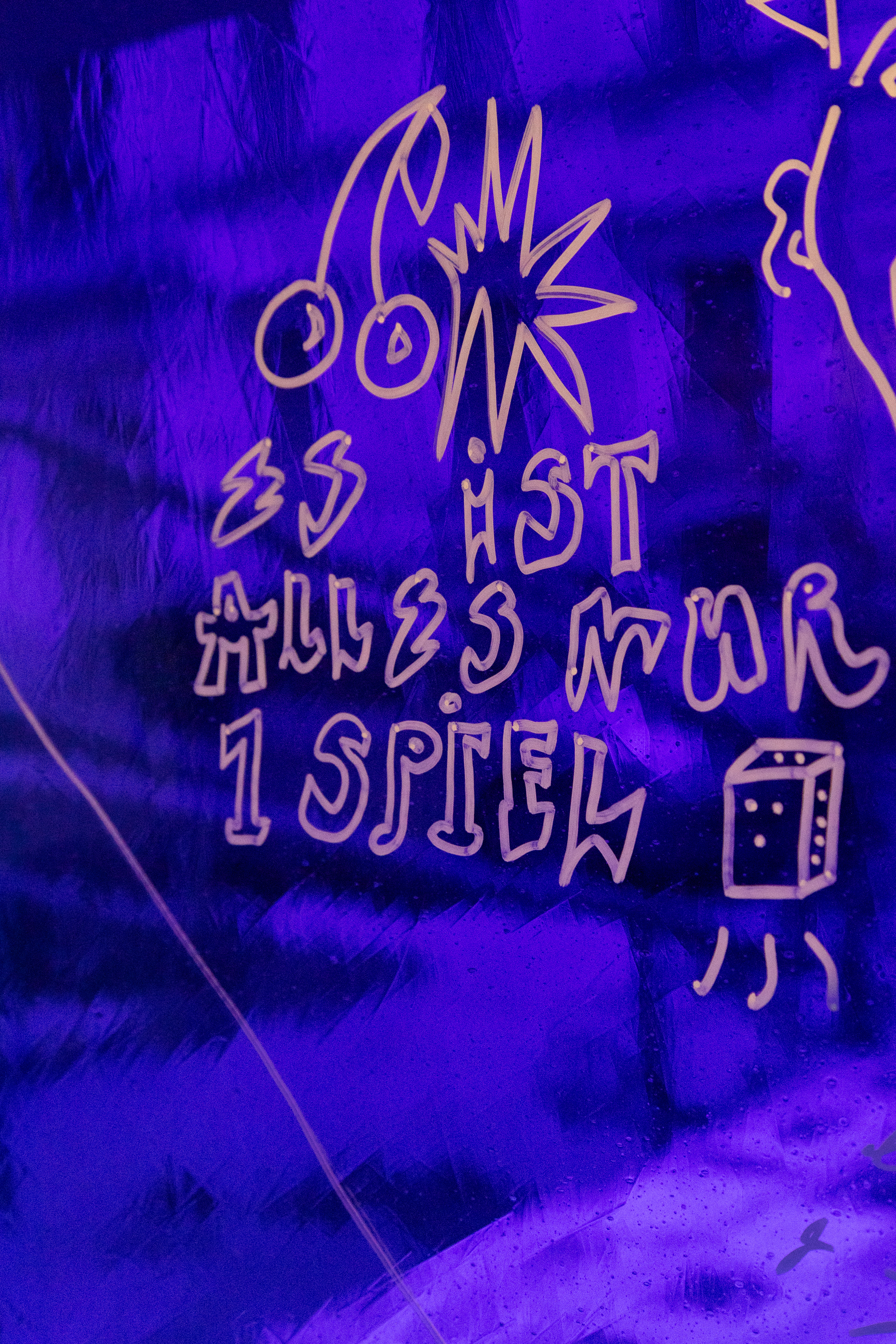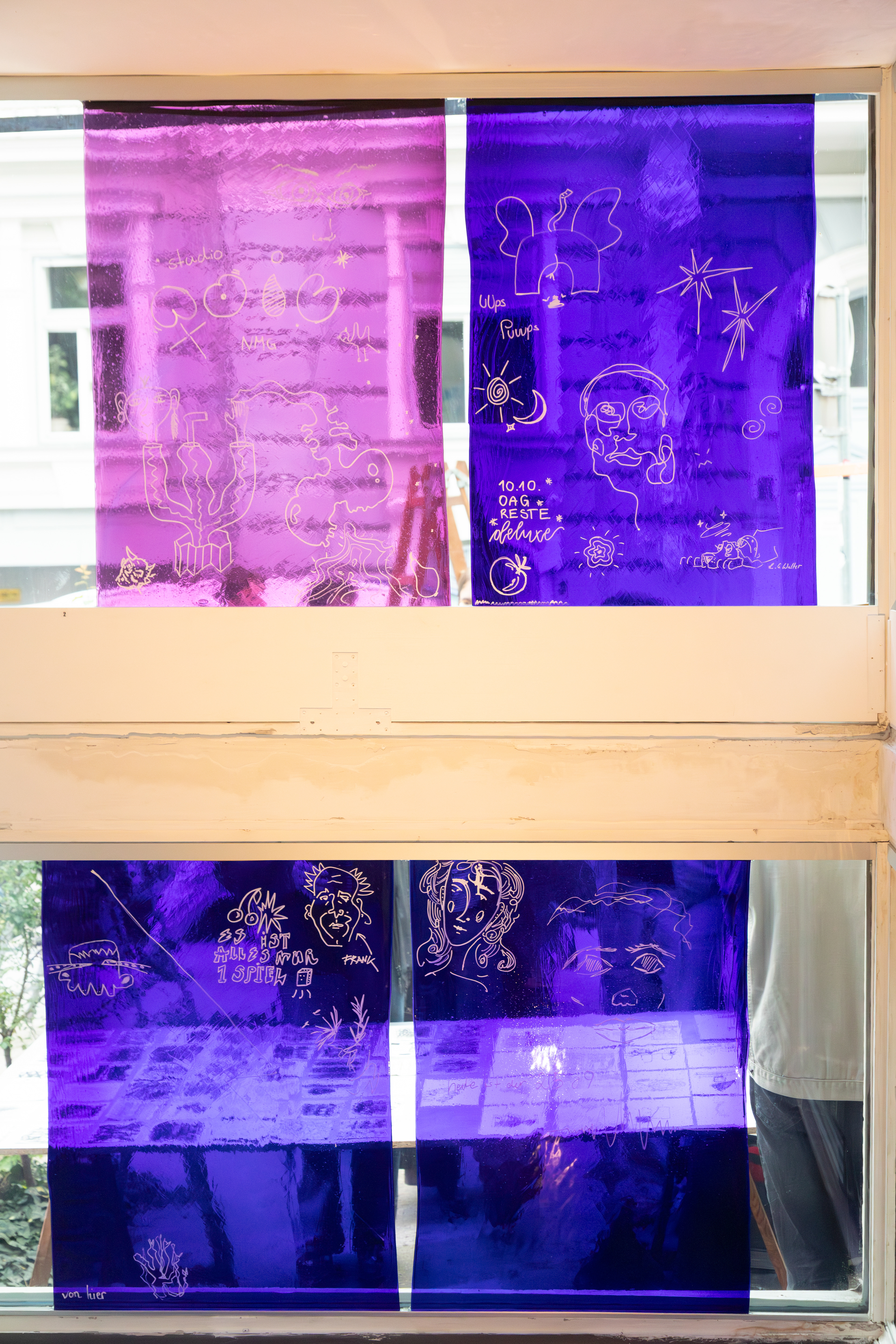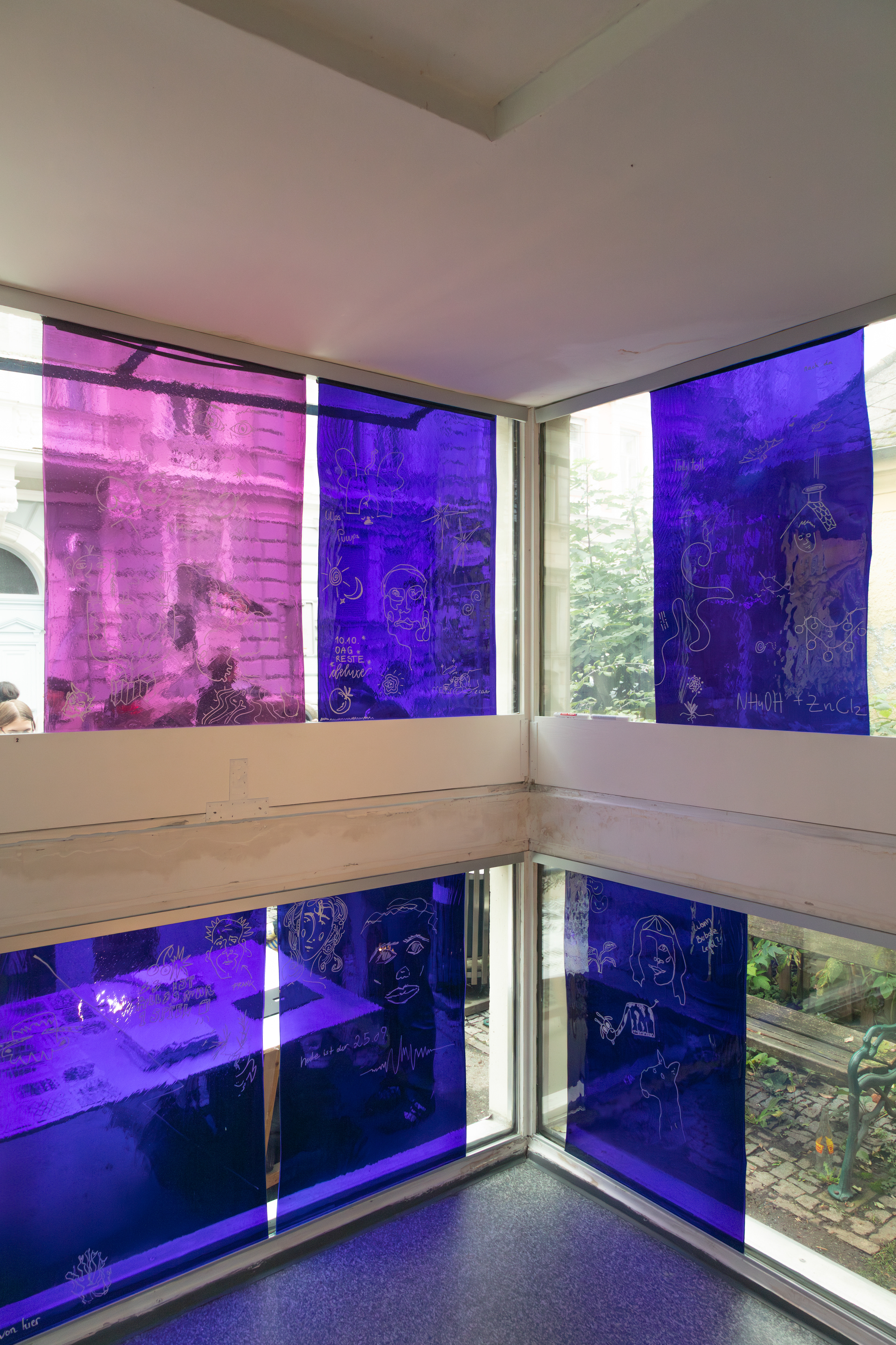 In einer von Fensterflächen gefassten Raumecke schafft eine Anordnung mundgeblasener, blauer Gläser eine dichte, atmosphärische Situation. Farbiges Glas – meist aus sakralen Kontexten vertraut – erhält hier im urbanen Raum eine neue Bedeutung: als Medium für Sichtbarkeit, Kommunikation und soziale Resonanz. Besucher*innen sind eingeladen, sich mit narrativer Zeichensprache, visuellen Symbolen, Icons, persönlichen Zeichen etc. einzubringen. Individuelle Gesten formen ein gemeinschaftliches Bild. Die Installation versteht sich als offener Prozess und als Einladung zur Reflexion: Welche Geschichten wollen wir erzählen? Welche Spuren hinterlassen wir? Wie gestalten wir Gemeinschaft und öffentlichen Raum?
