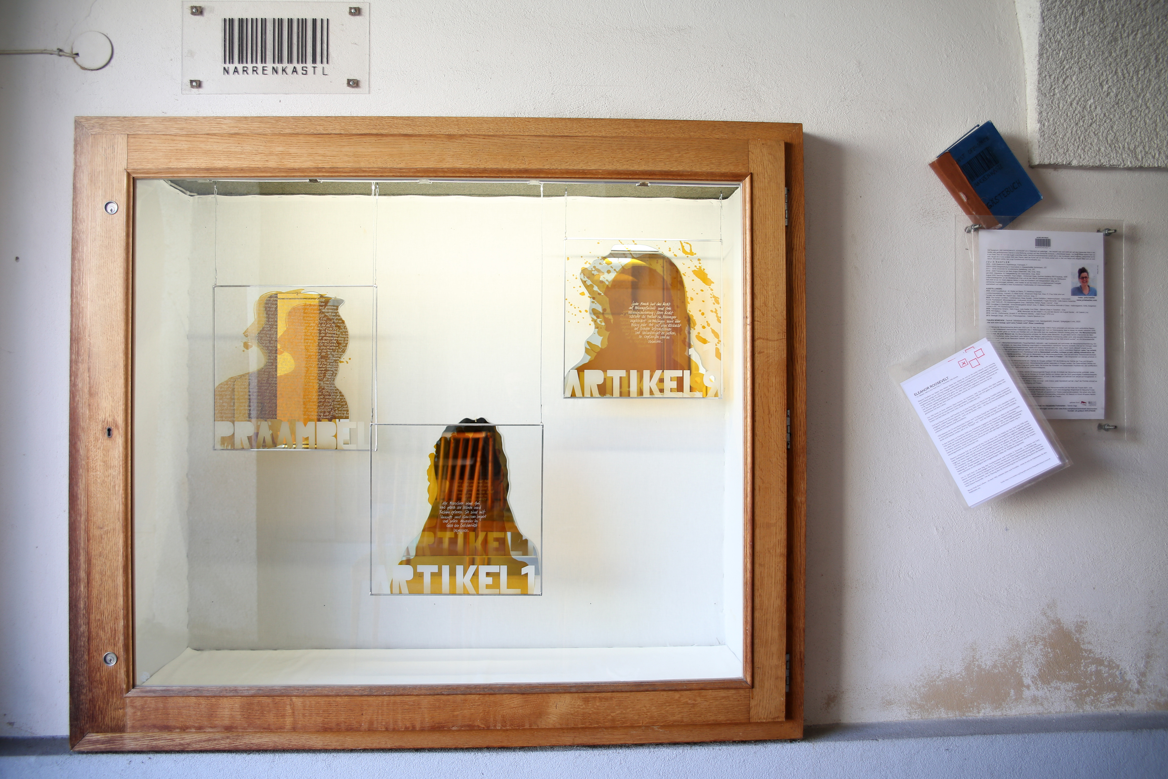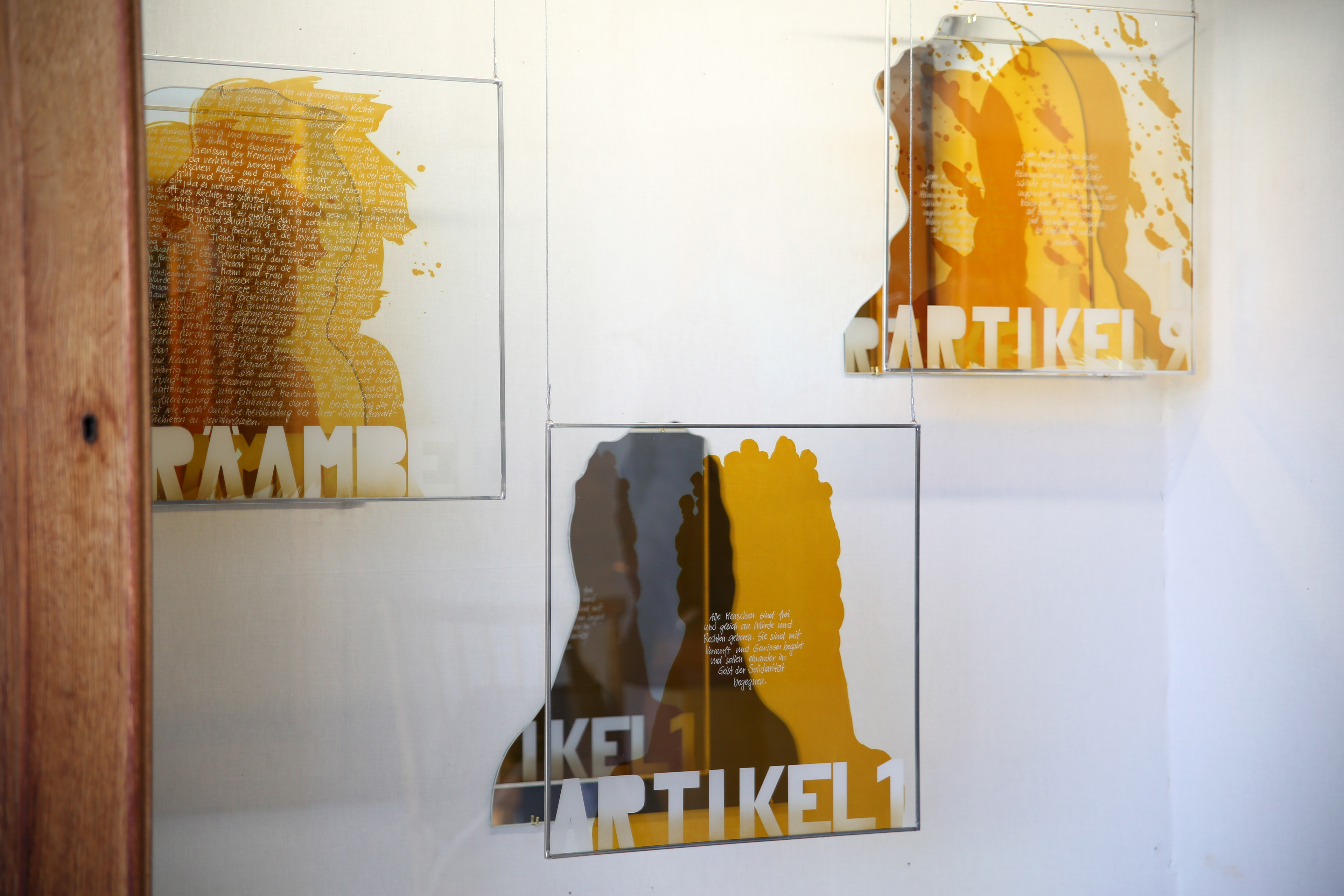 Floatglas mit Silberbeize, sandgestrahlt, graviert, gefasst; Freiform Spiegelglas, je 40x40 cm