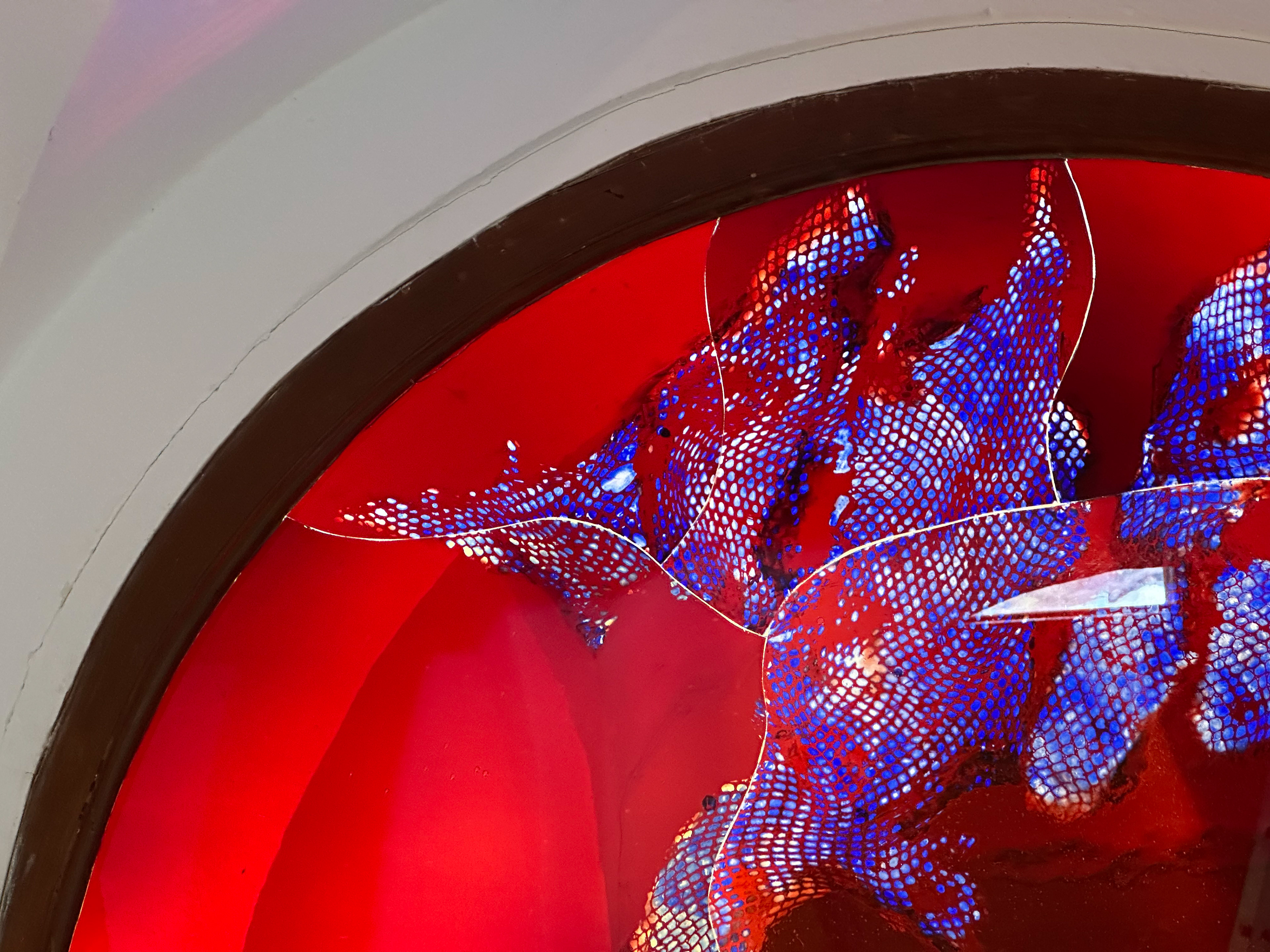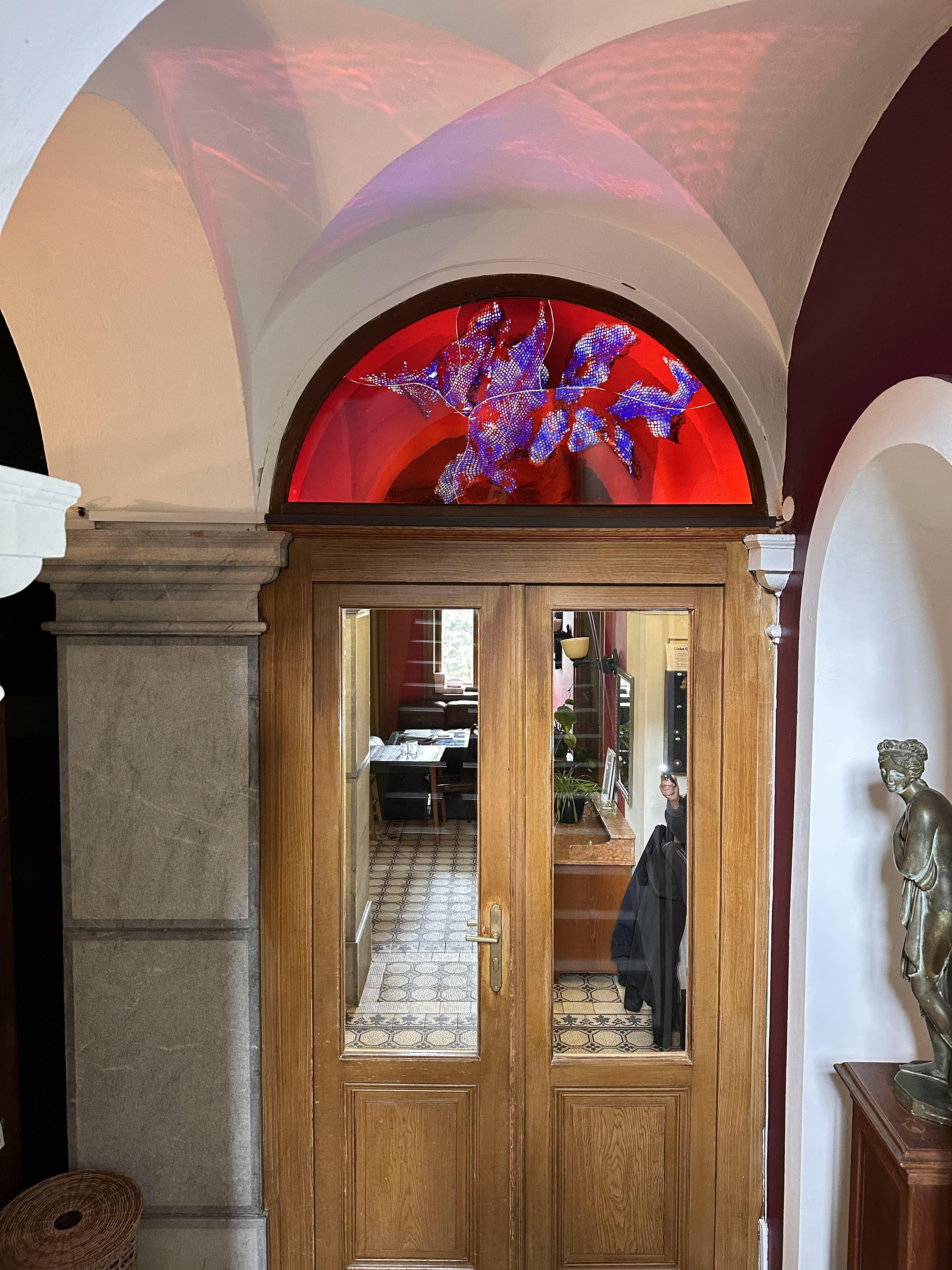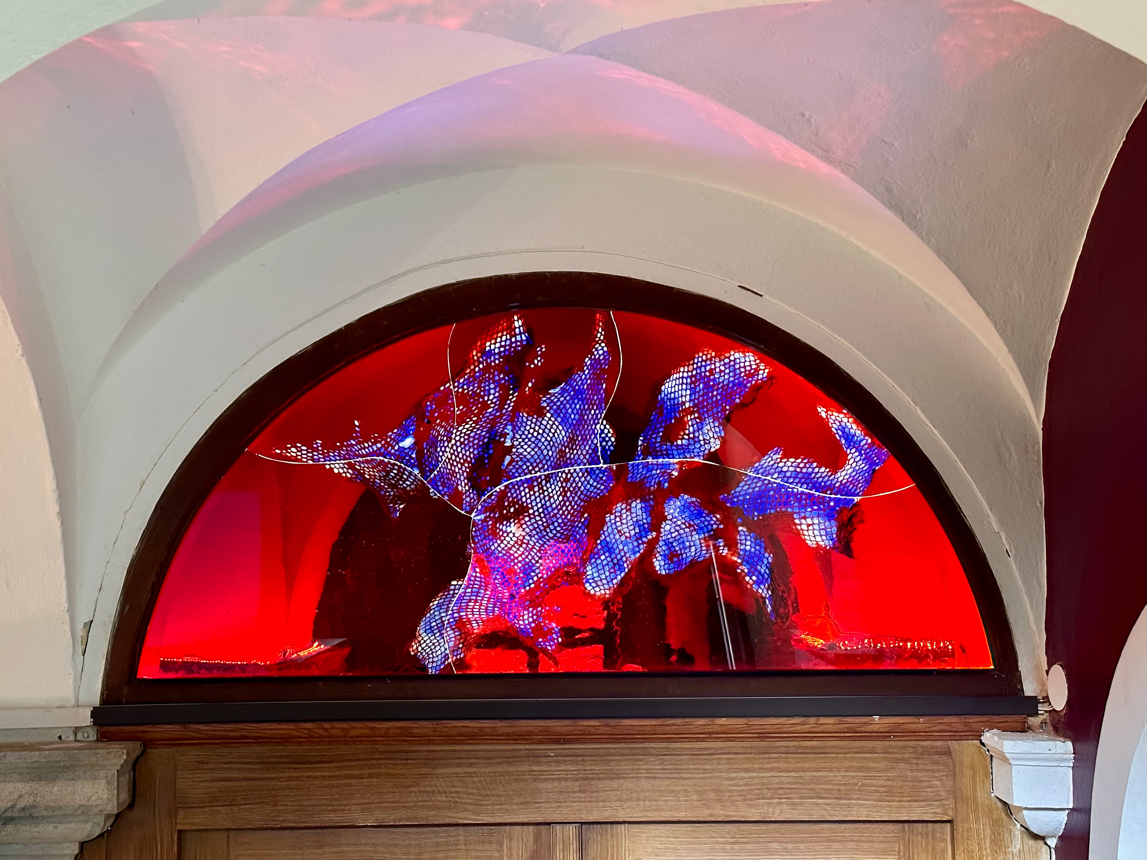 Überfangglas, sandgestrahlt, Emailglasmalerei, laminiert