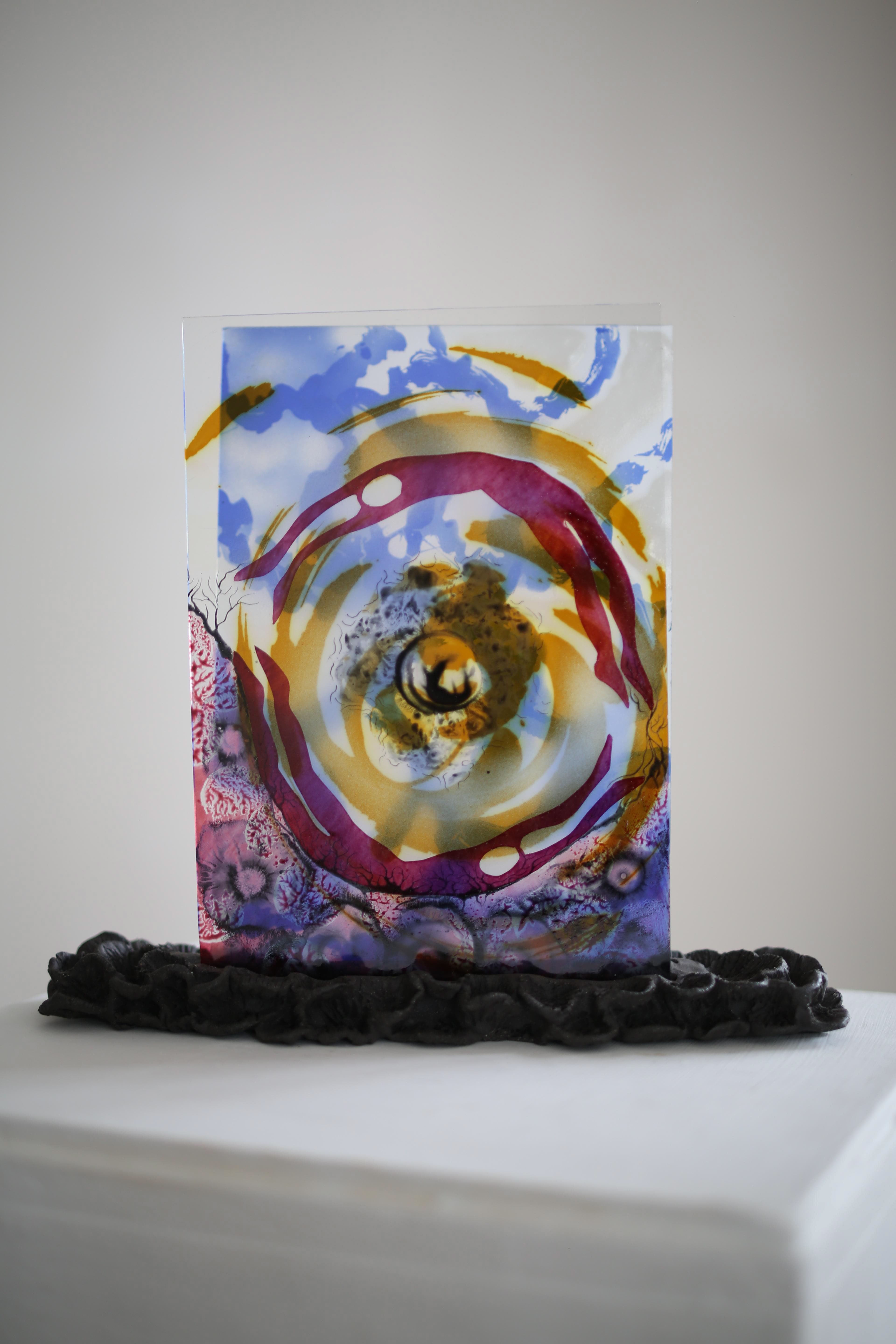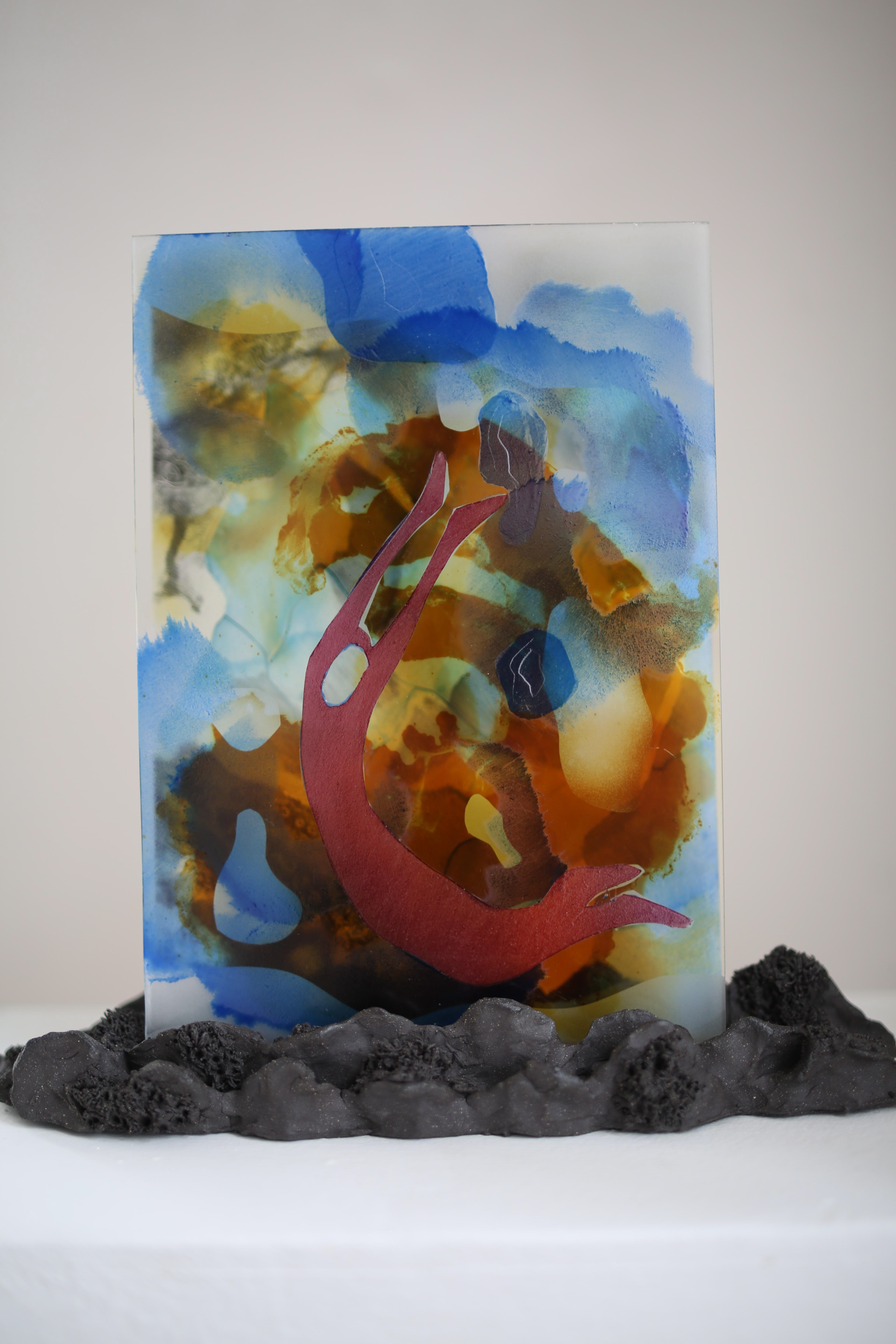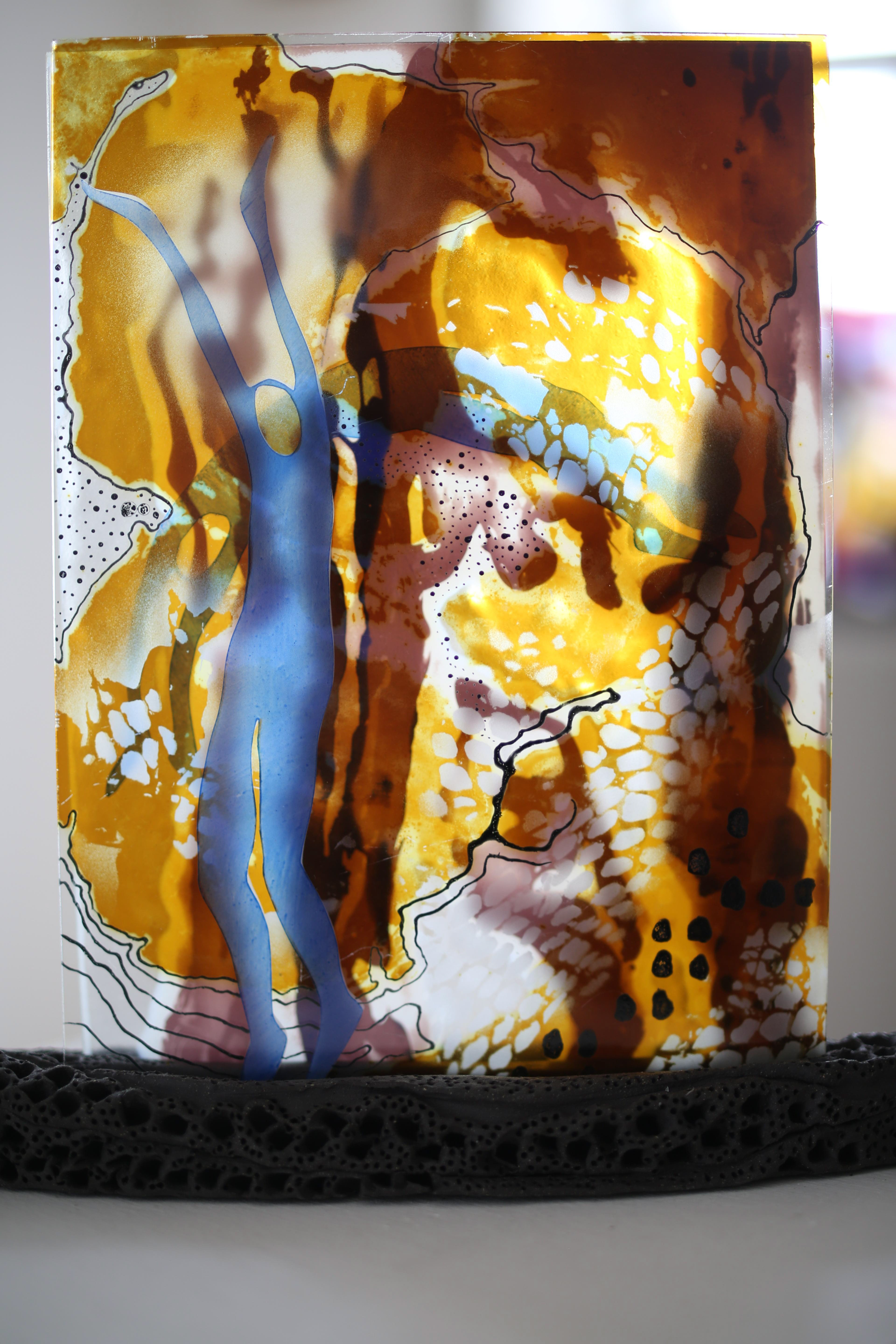 je 19 x 28 cm, Objekt aus 2 Gläsern mit integriertem Tonsockel, Schwarzlot- und Emailglasmalerei auf 3 mm Floatglas und mundgeblasenem Überfangglas, Silberbeize, sandgestrahlt