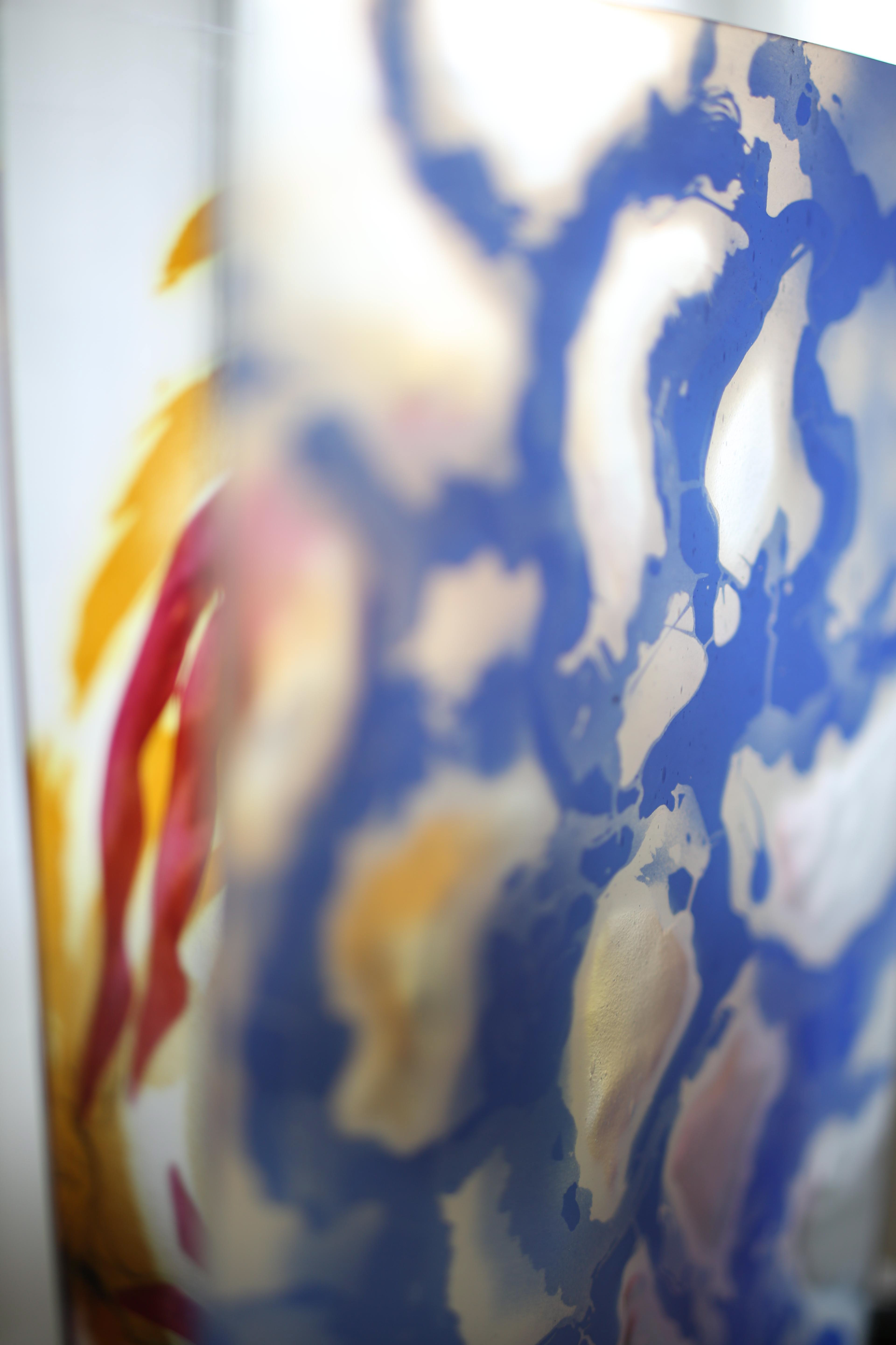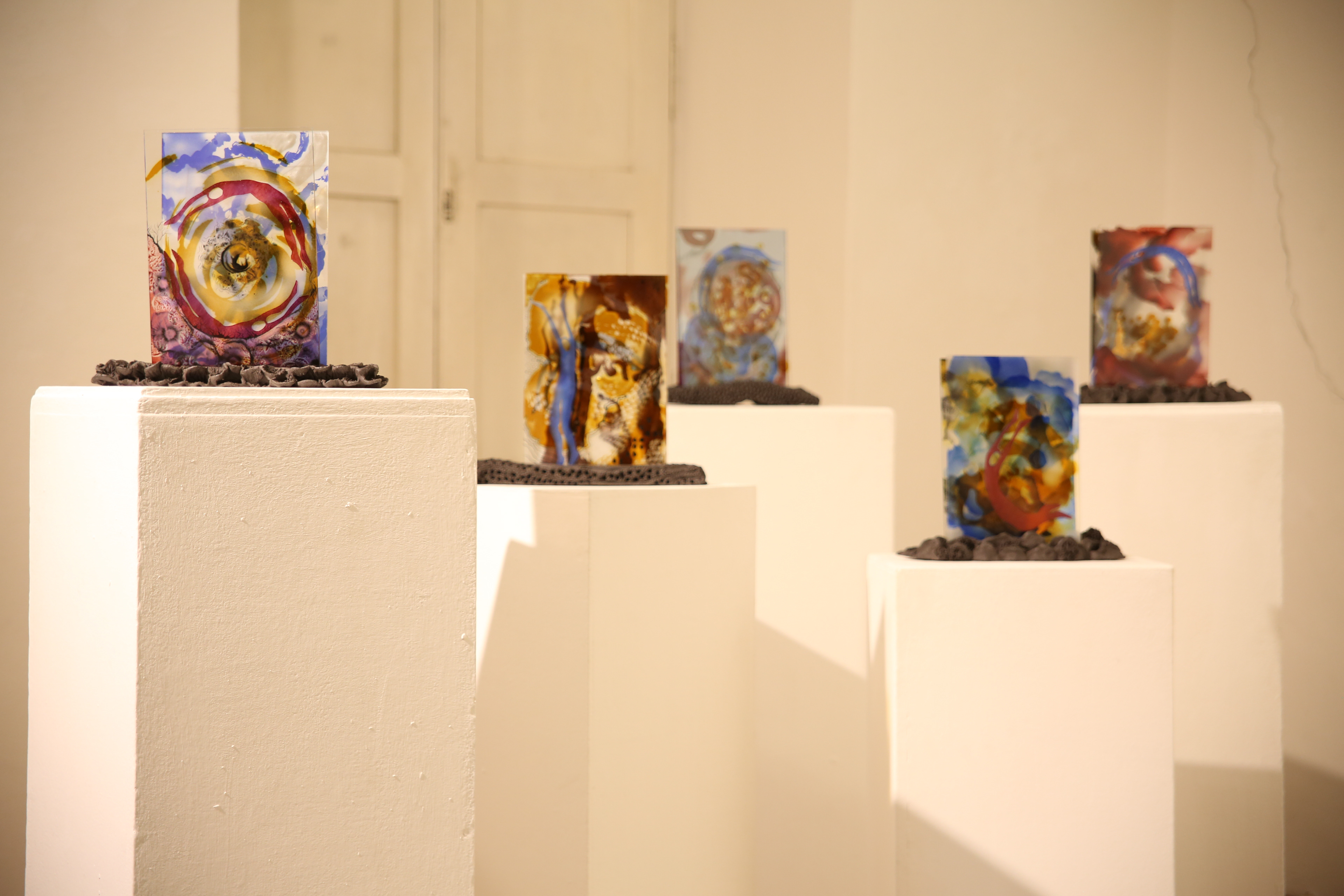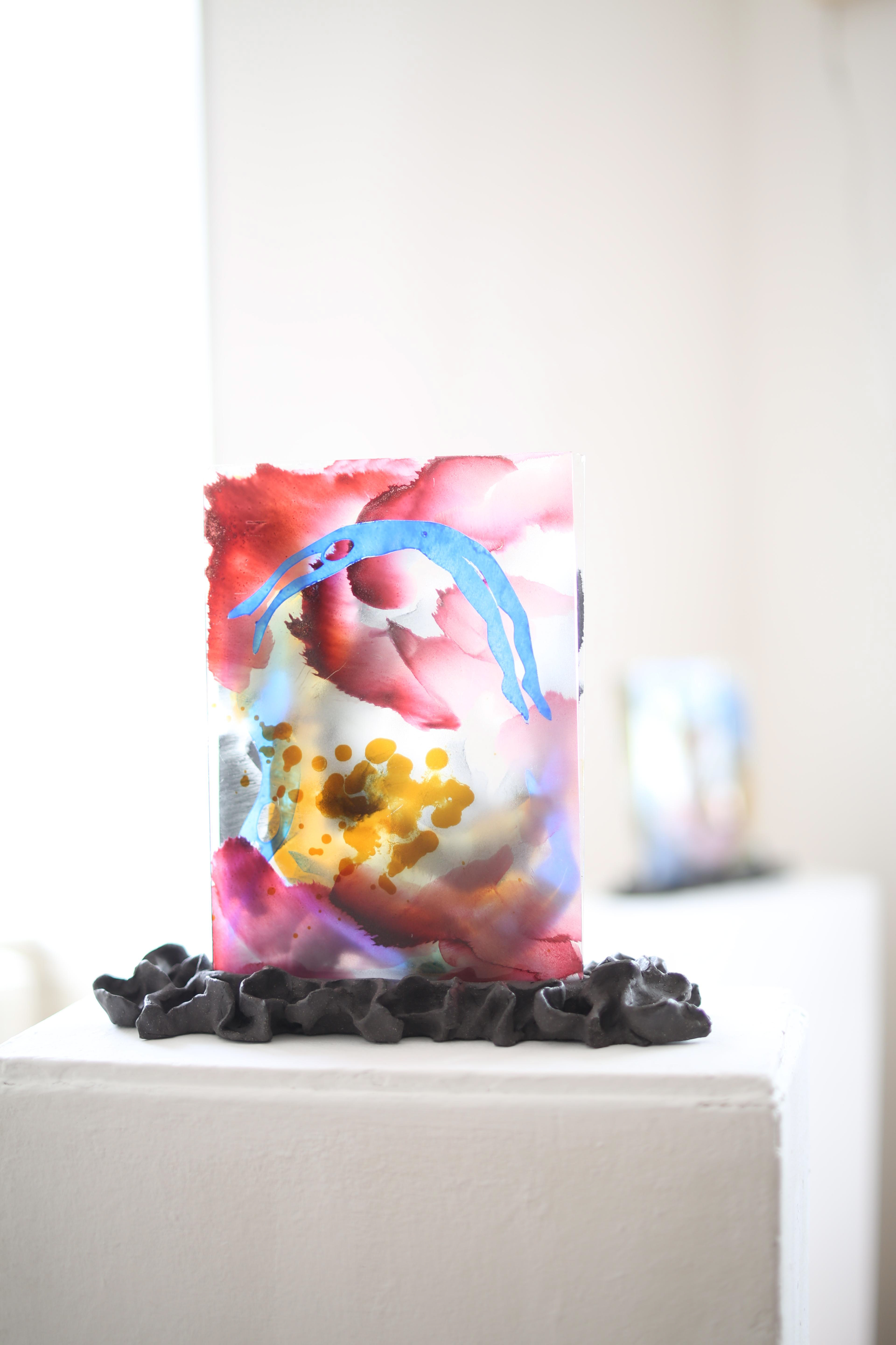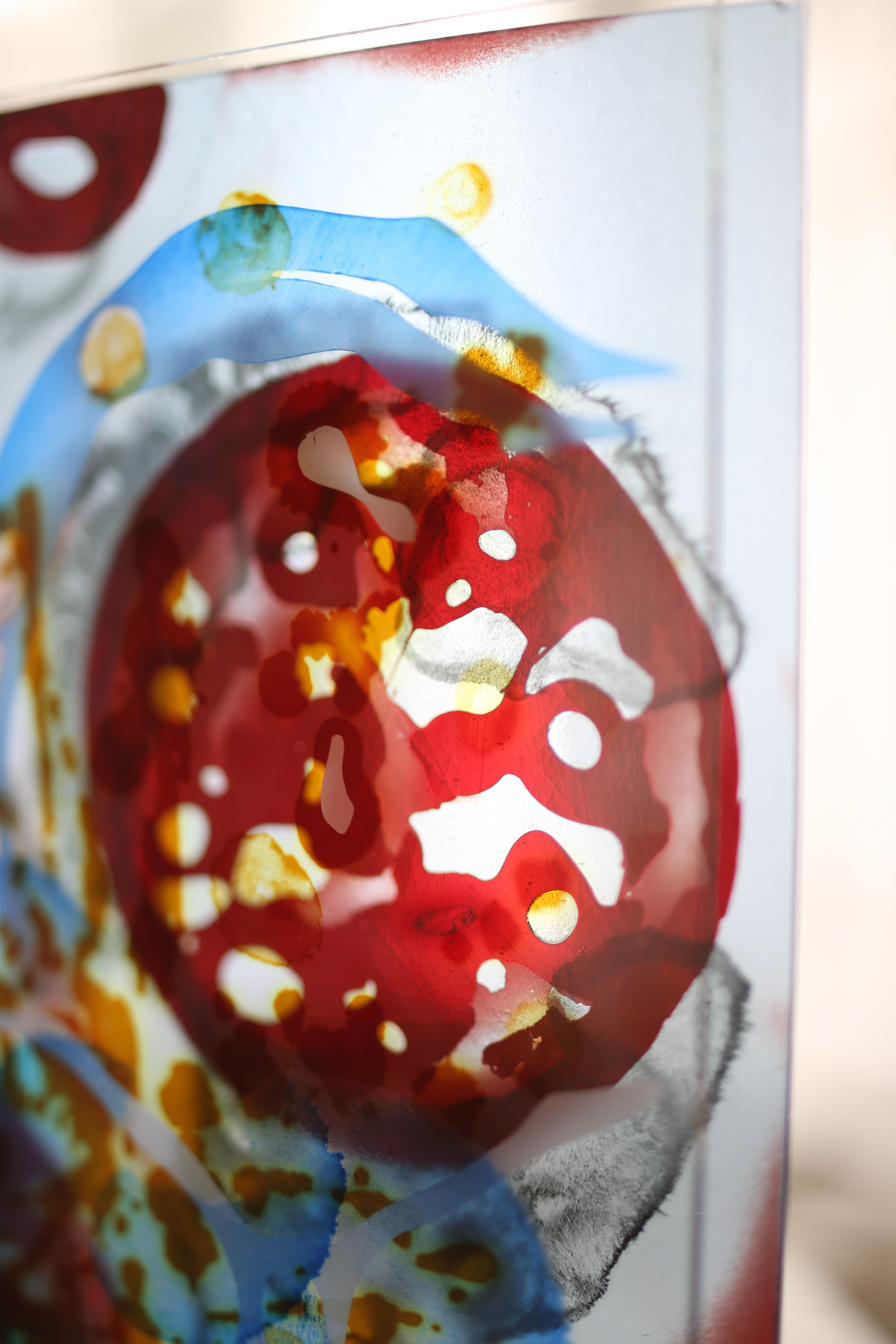 je 19 x 28 cm, Objekt aus 2 Gläsern mit integriertem Tonsockel, Schwarzlot- und Emailglasmalerei auf 3 mm Floatglas und mundgeblasenem Überfangglas, Silberbeize, sandgestrahlt